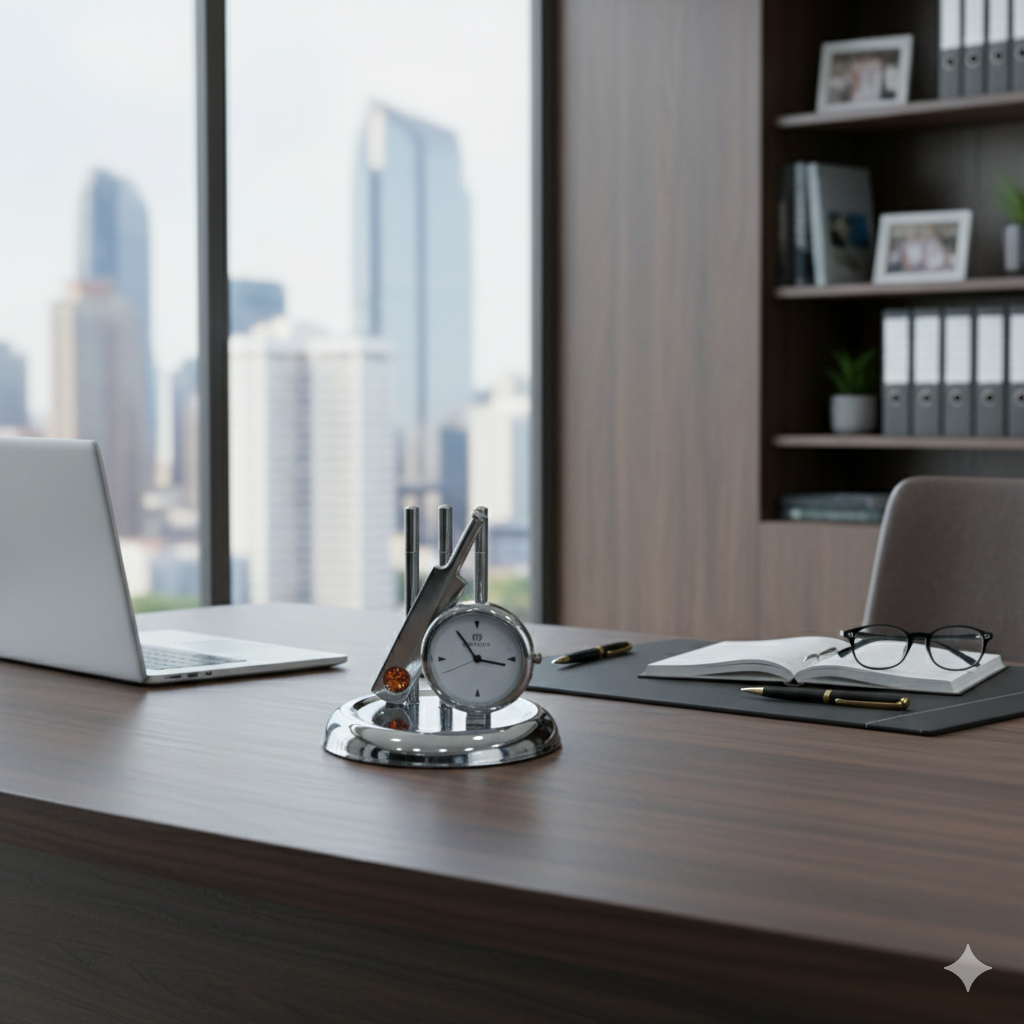 Relive the thrill of World Cup-winning moments with the Cricket Bat & Stumps Desk Clock from KARAT25. Designed with a sleek chrome finish, this premium desk accessory captures the spirit of the game with its detailed miniature bat and stumps set on a round base. A functional clock is seamlessly built into the design, making it both a decorative showpiece and a practical timekeeper.