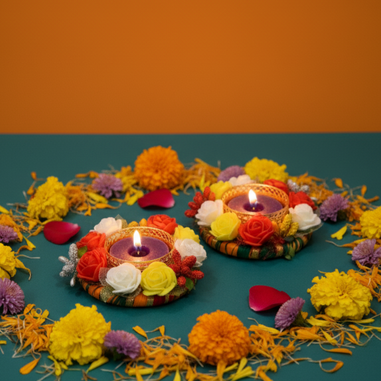 Meticulously handcrafted, each holder features a sturdy base wrapped in traditional fabric, adorned with a lush ring of multi-coloured artificial flowers. The intricate arrangement of red, yellow, and white roses creates a beautiful marigold-like effect that is central to festive decor. When you place a lit tealight in the center, the gentle flame illuminates the petals, creating a mesmerizing and warm glow.