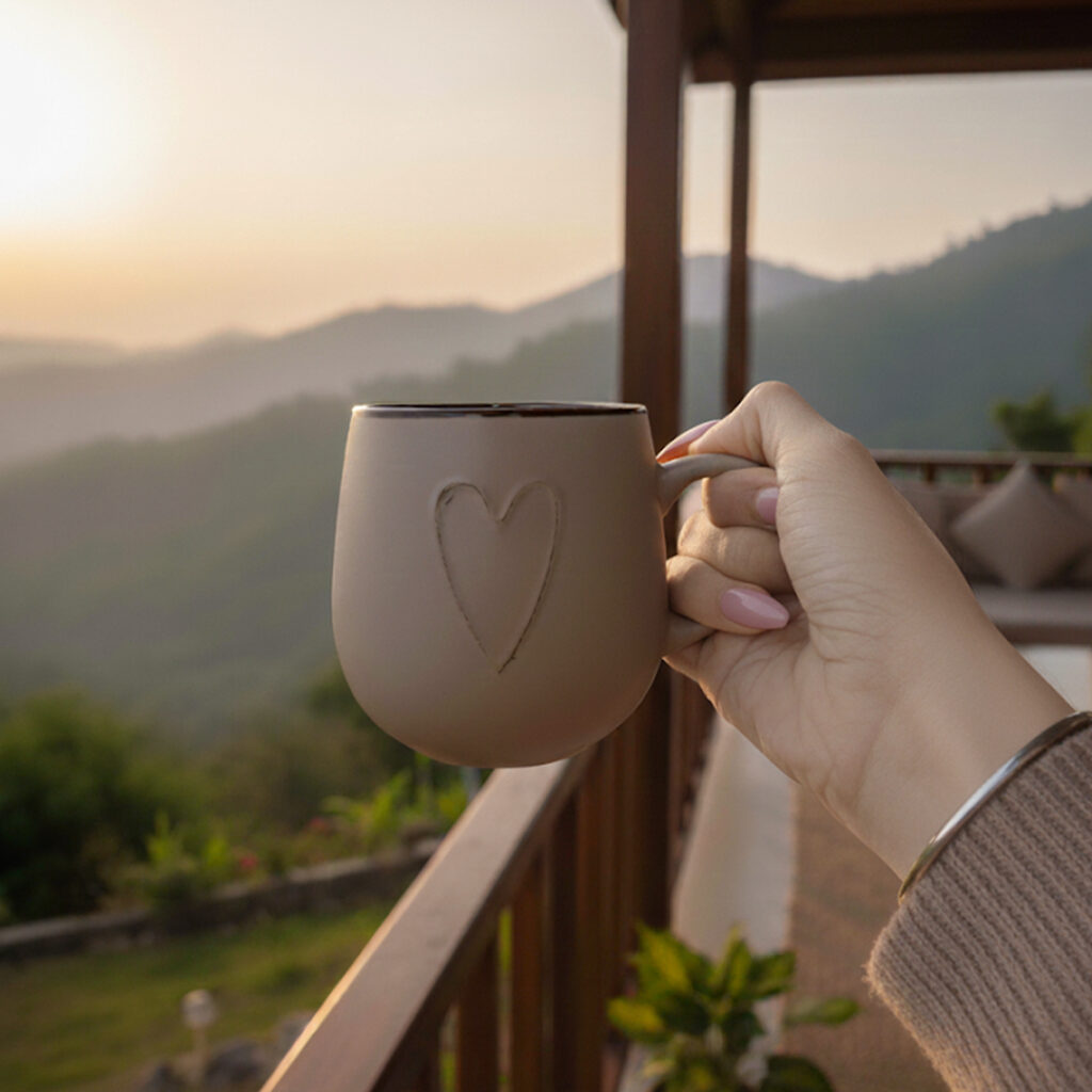 Its generous, rounded shape is designed to be cupped comfortably in your hands, offering a comforting warmth with every sip. The rustic, off-white glaze has a wonderfully tactile matte finish that feels earthy and natural. At its center, a simple, hand-carved heart serves as a gentle reminder to practice self-love and cherish simple joys. The contrasting dark rim adds a touch of refined detail to its minimalist aesthetic.